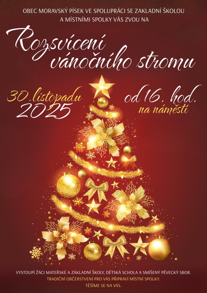 Obec Moravský Písek ve spolupráci se základní školou a místními spolky vás srdečně zve na rozsvícení vánočního stromu, které se uskuteční 30. listopadu od 16.00 na náměstí. Na akci se můžete těšit na vystoupení žáků mateřské, základní školy, dětské scholy a smíšeného pěveckého sboru. Místní spolky pro vás připraví tradiční občerstvení. Přijďte si užít vánoční atmosféru a strávit příjemné chvíle s rodinou a přáteli.