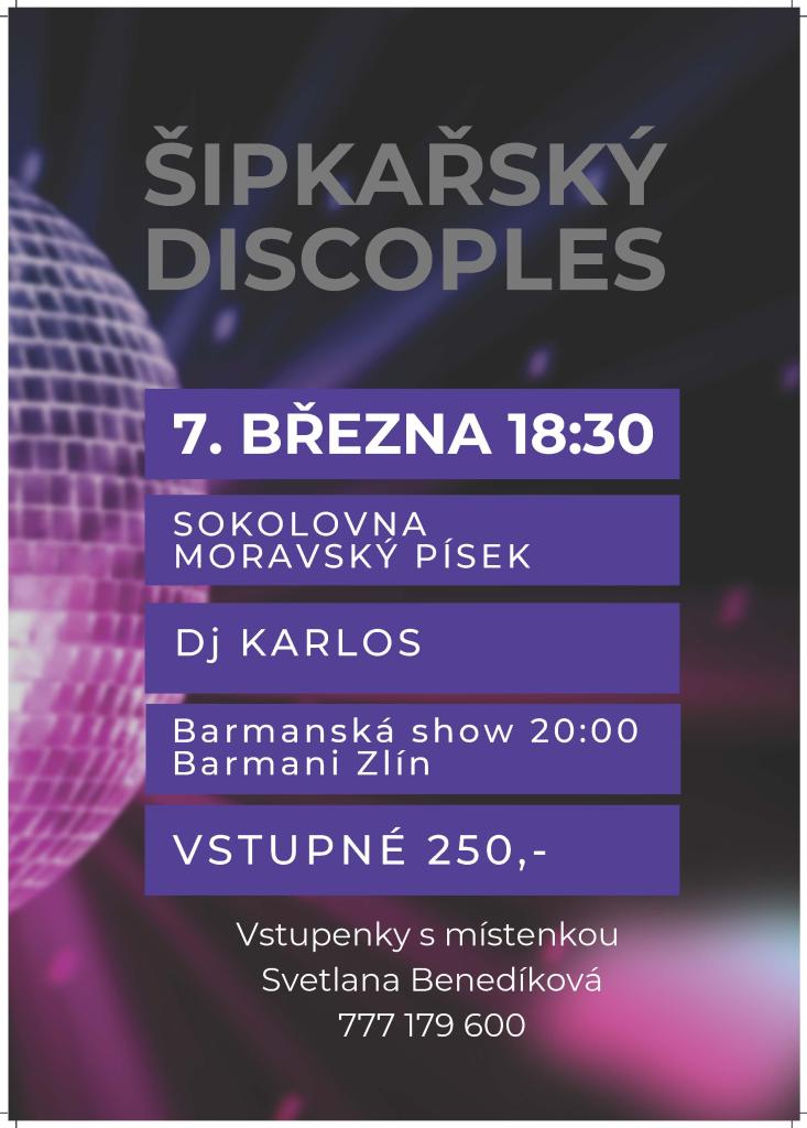 Zveme vás na Šipkařský discoples barmanskou show, který se uskuteční 7. března 2026 v 18:30 v sokolovně v Moravském Písku. Těšit se můžete na vystoupení DJ Karlose a na barmanskou show. Vstupné 250 Kč a vstupenky s místenkou si můžete zakoupit u Svetlany Benedíkové na telefonním čísle 777 179 600.